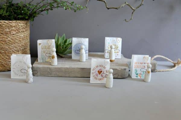 Der kleine, handbemalte Engel ist in einem Geschenktütchen aus Transparentpapier und ein kleines Kärtchen ist ebenso anbei.