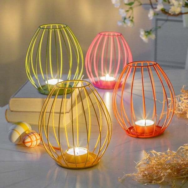 Für ein fröhliches Ambiente. Genau richtig für Frühlings- oder Sommerdeko. Bunte Windlichter aus Draht mit Glaseinsatz (bei der großen Variante) in grün, orange, gelb oder pink